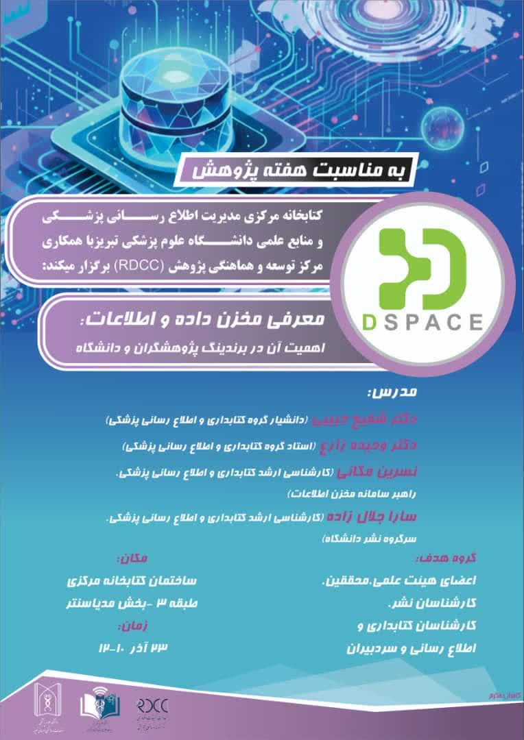همزمان با گرامیداشت هفته پژوهش و در راستای همنوایی با سیاست‌های مرکز توسعه و هماهنگی اطلاعات و انتشارات علمی وزارت بهداشت، درمان و آموزش پزشکی، مدیریت اطلاع‌رسانی پزشکی و منابع علمی  دانشگاه علوم پزشکی تبریز مجموعه‌ای از کارگاه‌ها و وبینارها را طراحی و از تاریخ 15 الی 25 آذرماه 1404 (به شرح ذیل) برگزار می کند: